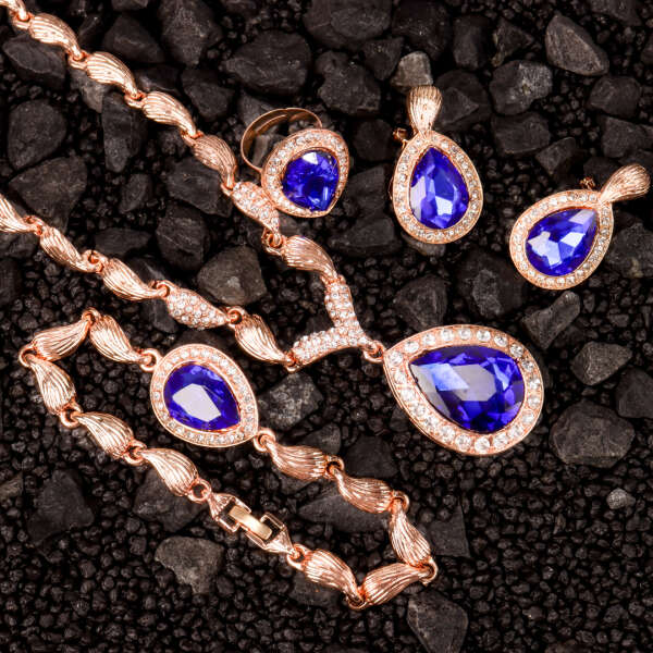 Yellty – Jewelry set. Glamourous set in golden and royal blue color has everything a woman needs to look and feel magnificent!. Luxe set with necklace, bracelet, ring and earrings!. Perfect for special occasions. Golden and royal blue glamour. The jewelry set is designed in a stunning combination of golden and royal blue colors, making it the perfect accessory to add to any outfit. The glamourous color scheme is sure to catch everyone’s attention and make you feel like the belle of the ball.. Blue stone decoration. All the pieces in the jewelry set are decorated with stones in blue color. The intricate and delicate decorations add a touch of luxury to each piece.. Complete jewelry set. This jewelry set comes with a necklace, ring, bracelet and earrings – all in matching style. You will have everything you need to complete any outfit and look absolutely stunning while doing so..